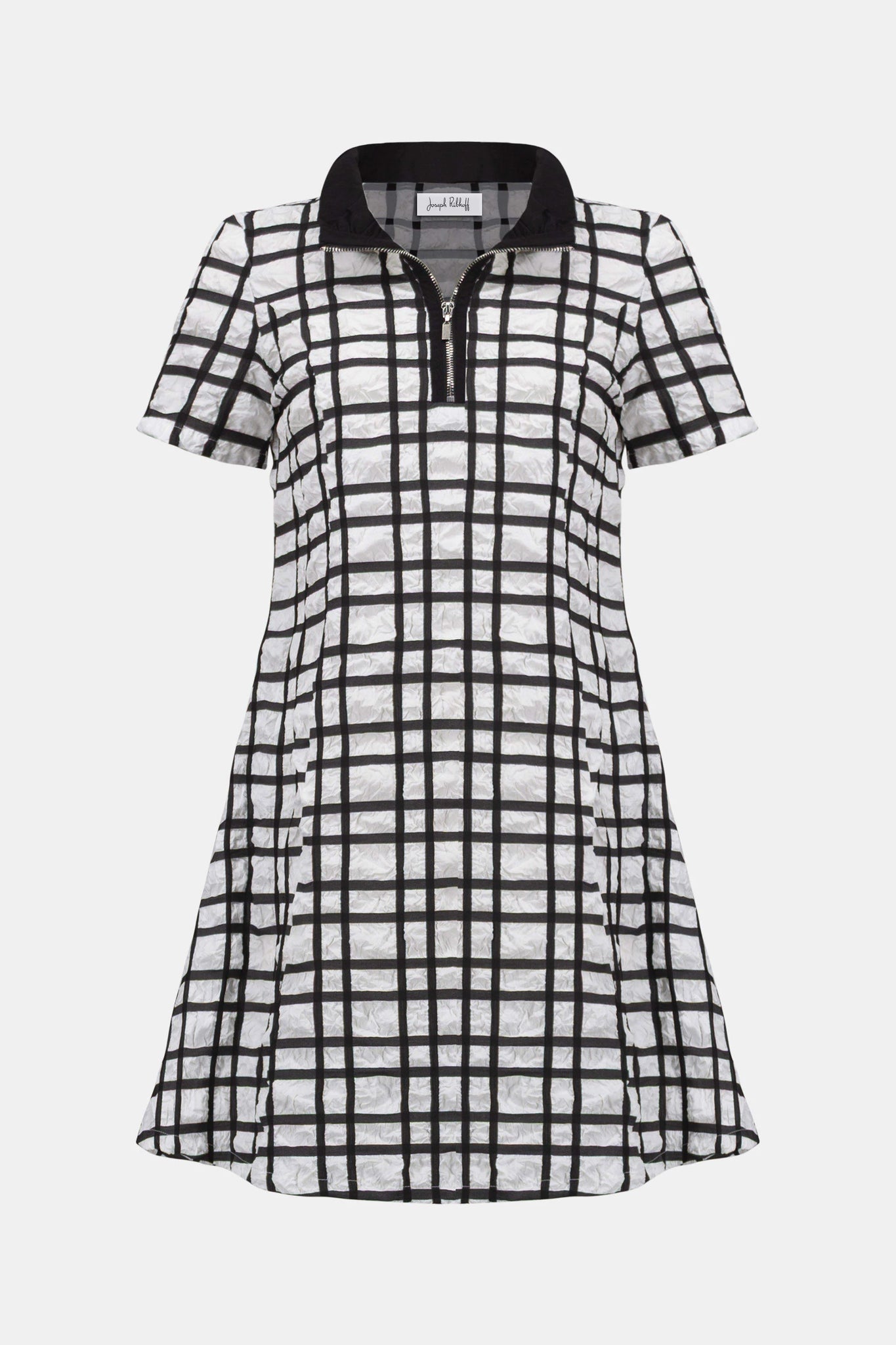 This plaid bubble jacquard dress blends everyday comfort with standout structure. A memory shirred funnel collar with front zipper adds volume, while short sleeves and inseam pockets keep the look grounded.
