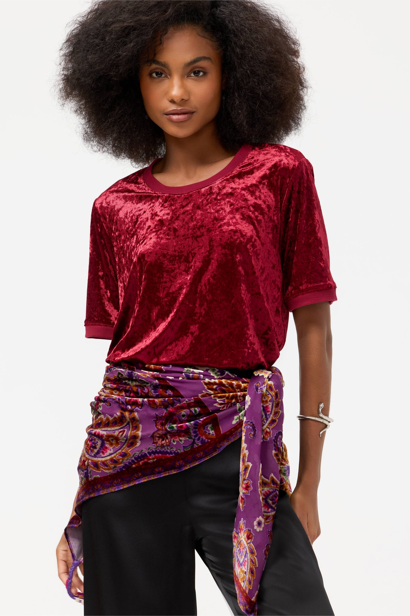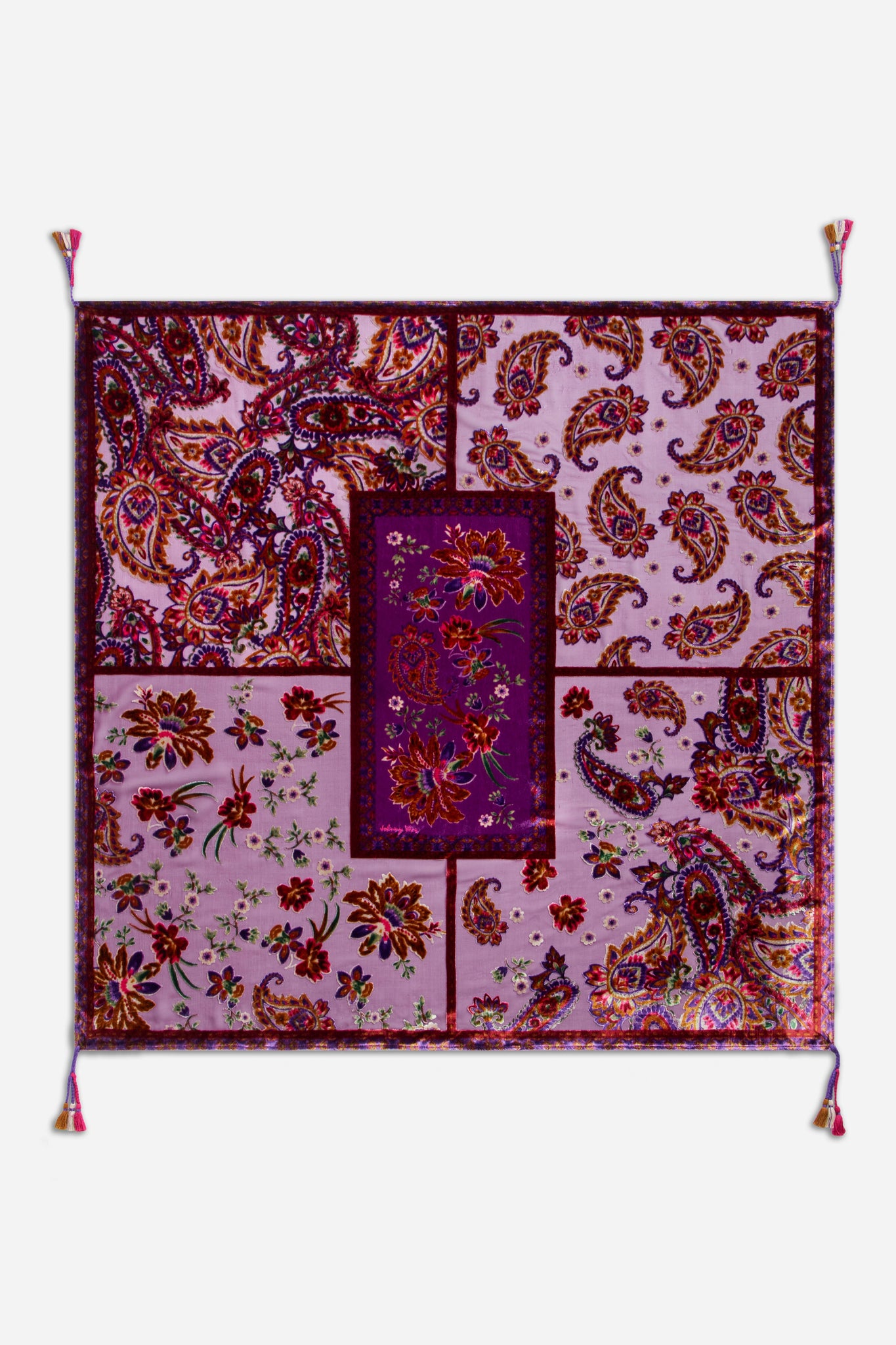 Beautifully embellished with a bold blend of rich paisley and vibrant florals, the Domitila Velvet Burnout Scarf is crafted from a rich silk blend. Featuring a velvet texture on one side and a patchwork pattern on the other, this scarf is finished with braided tassels at each corner.