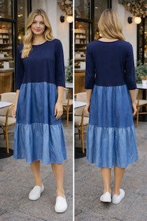 Effortlessly stylish and easy to wear, this three tiered denim dress is designed for relaxed everyday wear. Featuring a soft navy jersey bodice, classic round neckline, 3/4 sleeves, it flows into a beautifully tiered skirt in complimentary shades of denim blue.