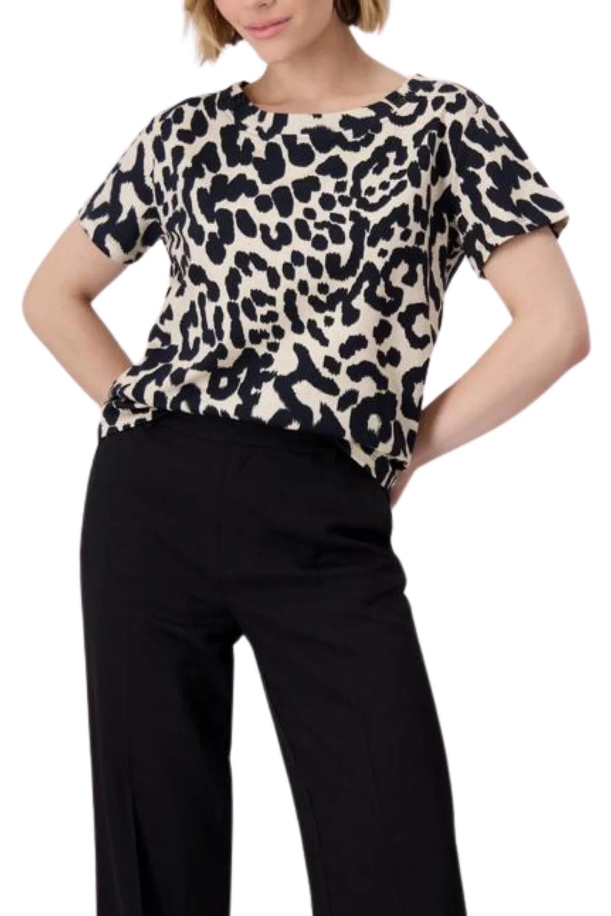 Make a statement with the black and cream animal print tee from Monari. Featuring short sleeves and a wide round neckline, this top adds a touch of elegance with a hint of black sparkle on each side of the neckline.