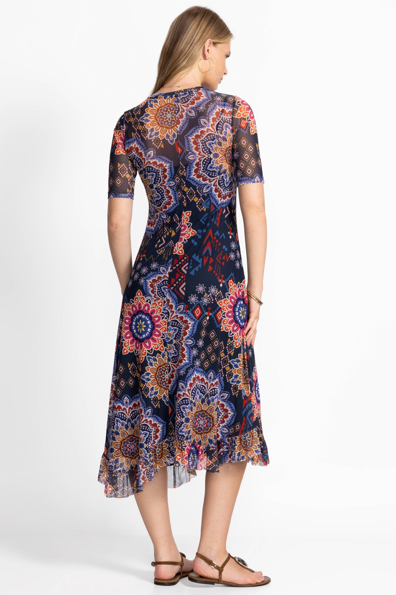 Crafted from a lightweight breathable mesh fabric, the Mesh Elbow Sleeve Asymmetric Hem Dress is embellished with a retro-inspired floral pattern. Designed with a crew neckline and elbow-length sleeves, this slip-lined dress is finished with a ruffled asymmetrical hemline.