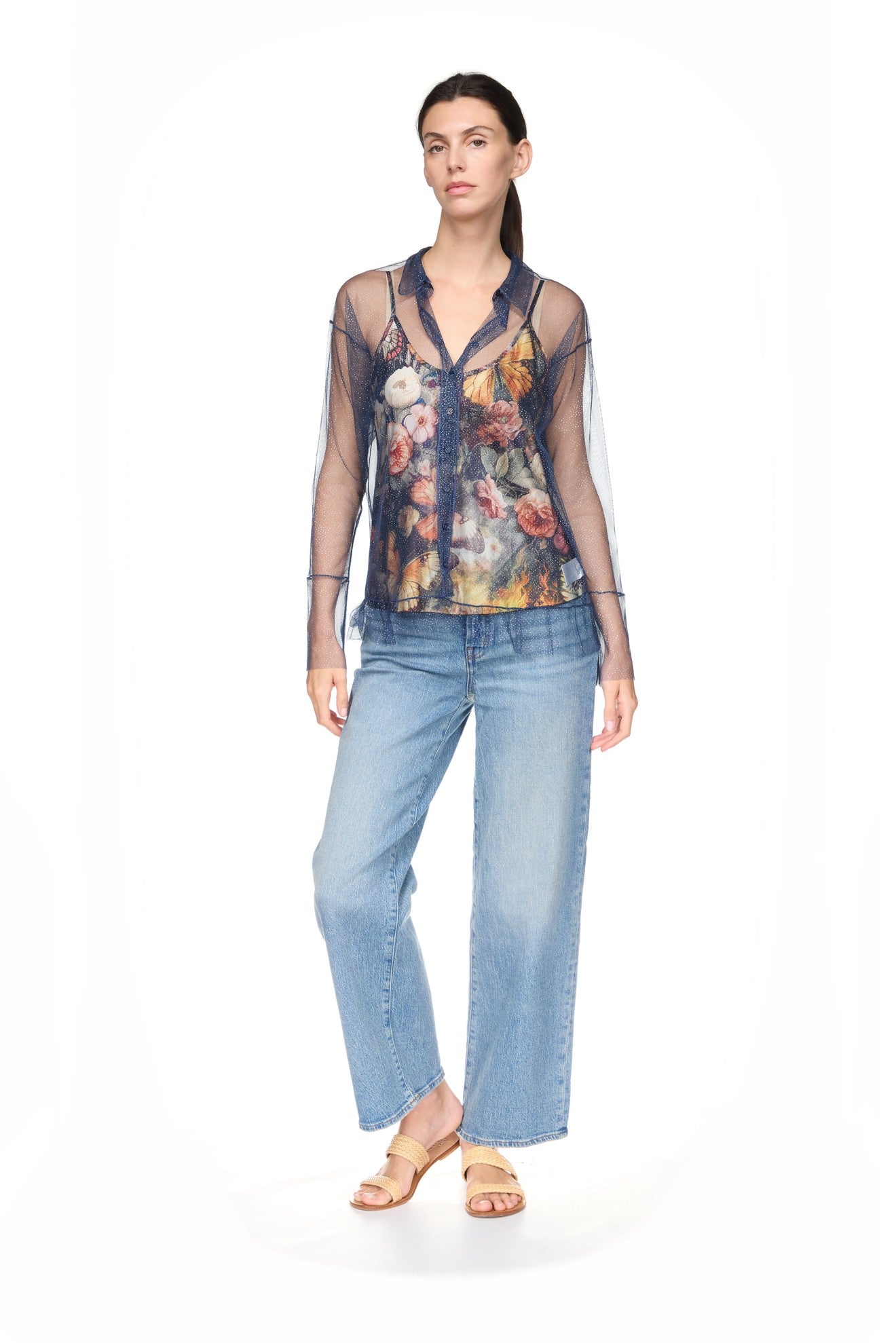 Crafted from a lightweight navy blue mesh fabric, dotted with delicate silver foil featuring a classic collared button-front and long sleeves. The Mazzy Button Down Blouse will work with any colour cami underneath however the cami provided is patterned with butterfly motifs in silky fabric with adjustable shoe string straps . Featuring a classic collared button-front and long sleeves.  Pair with wide-leg pants and neutral pumps for a fresh evening out or casual look
