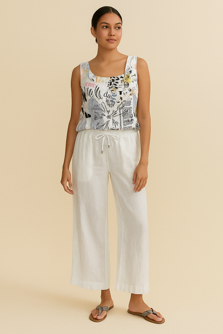 Dolcezza Linen Leaf Print Top 25140 - Beige Black